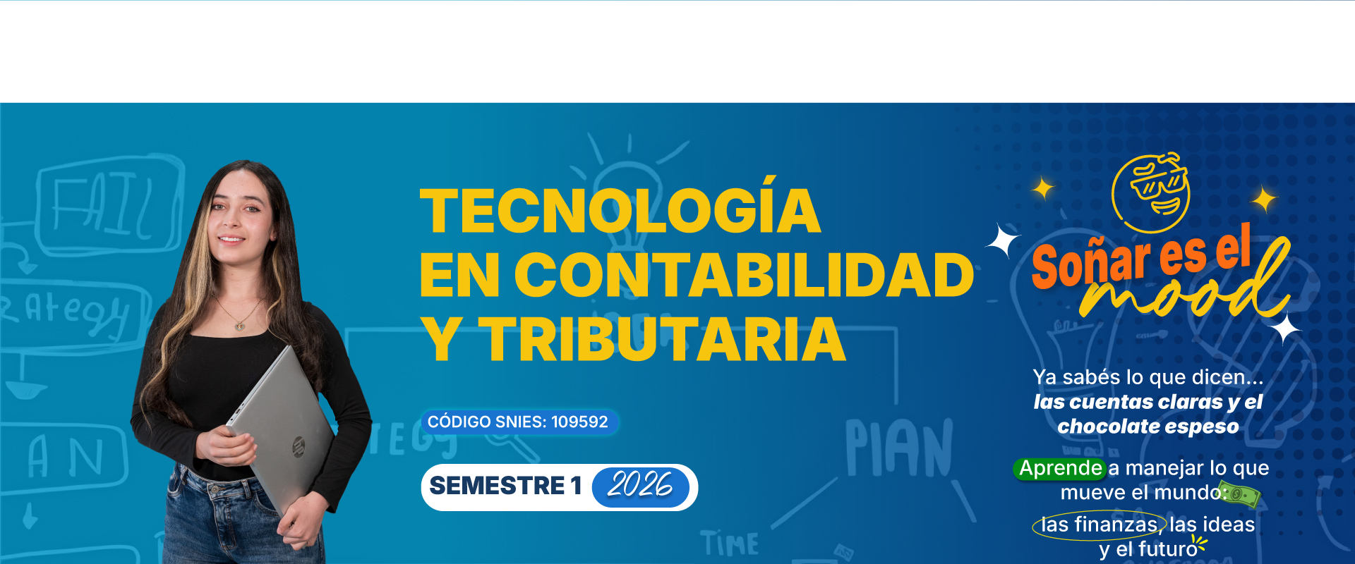 Con el programa Tecnología en Contabilidad y Tributaria, se proyecta ofrecer formación tecnológica en el campo contable y tributario para el desarrollo de competencias que formen al estudiante en herramientas para hacer la lectura del contexto y aportar en la problemática del mundo empresarial y económico, desarrollando en él, además, las competencias necesarias para la regulación contable y fiscal y aplicarse en su desempeño laboral.